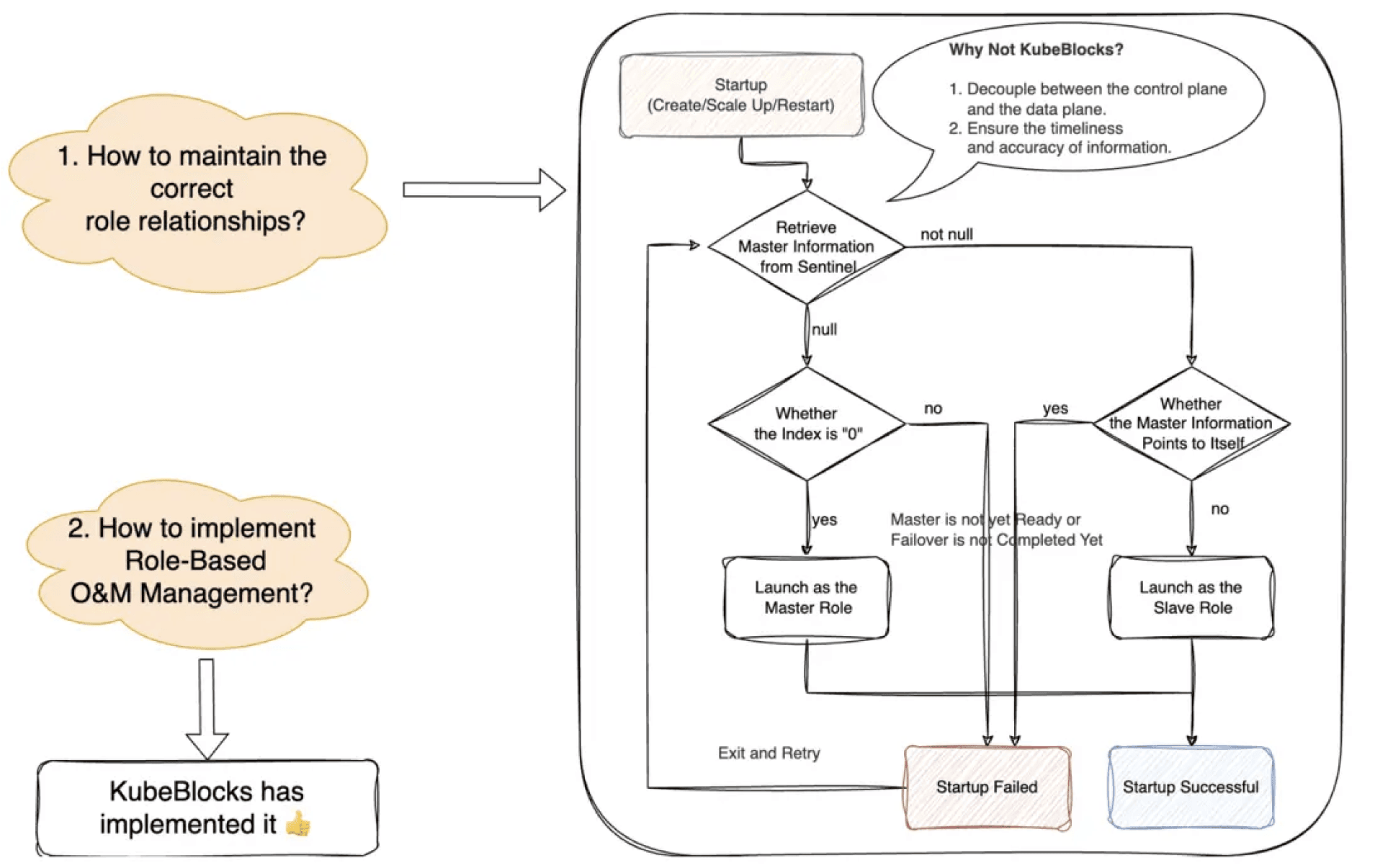 我们重点关注如何维护正确的角色关系,有一件重要的事情需要注意。我们认为,单个分片的主节点信息非常重要。如果发生错误或无法获取,将会导致严重的问题。因此,为了确保业务的稳定性,我们倾向于在此处分离数据面(data plane)和控制面(control plane)。这就是为什么我们不从 KubeBlocks 获取主节点信息的原因。