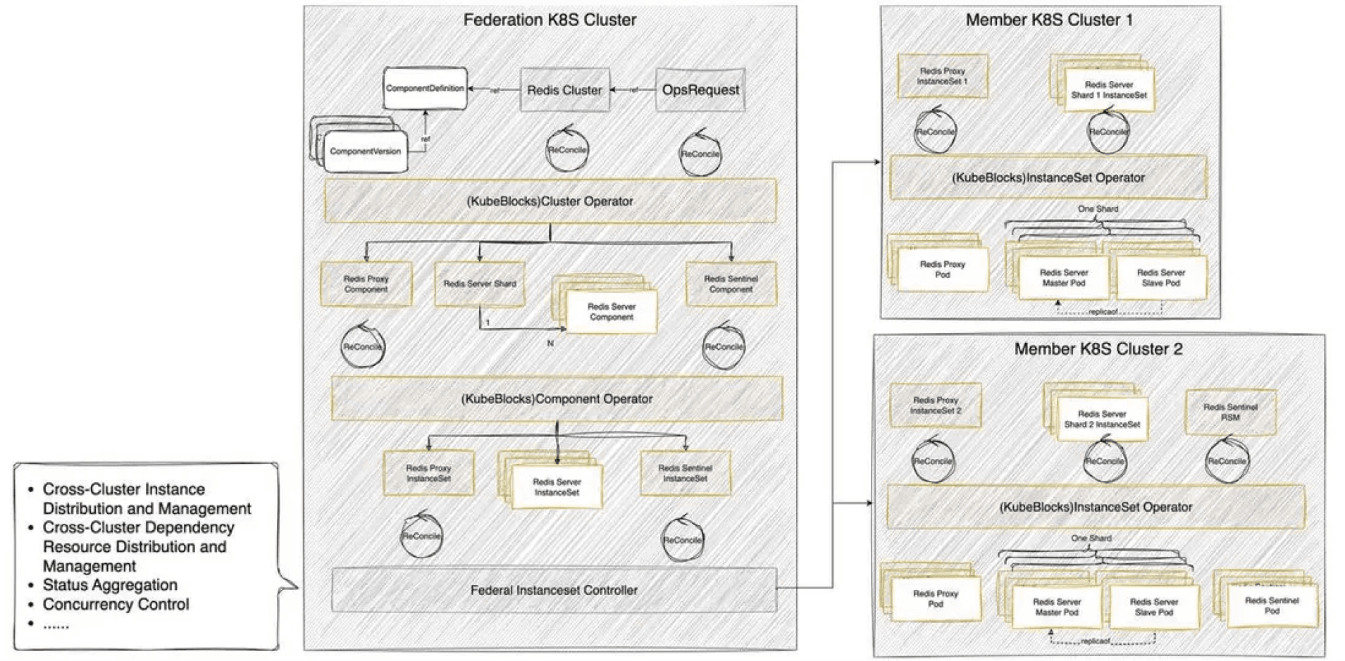 我们将 KubeBlocks operator 拆分为两部分。Cluster Operator 和 Component Operator 放置在联邦集群中,而 InstanceSet Controller 放置在成员集群中。在中间,有一个名为 Federal InstanceSet 控制器的组件,用于将 InstanceSet 对象从联邦集群分发到成员集群。那么,Federal InstanceSet 控制器是如何工作的呢?